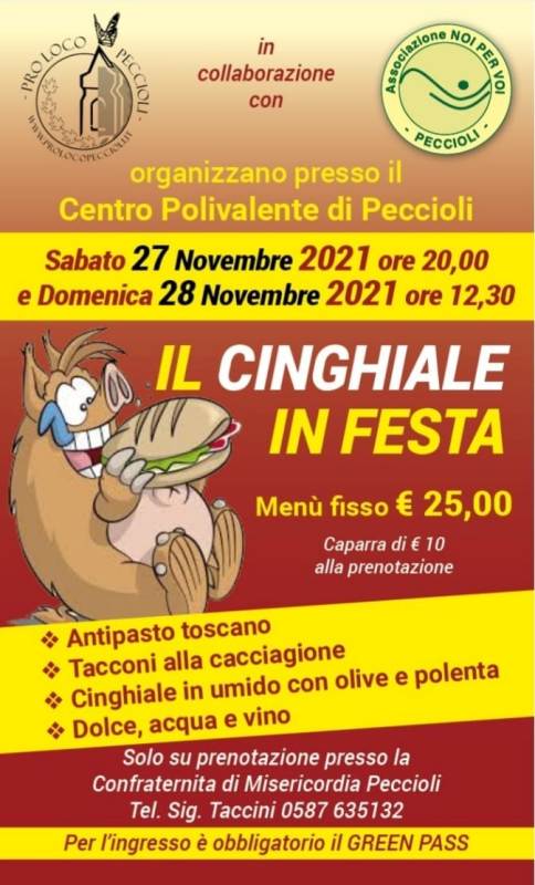 Per cenare o pranzare a "Il cinghiale in festa" occorre prenotare alla Misericordia di Peccioli, telefonando allo 0587 635132. All'ingresso sarà richiesto il Green pass.