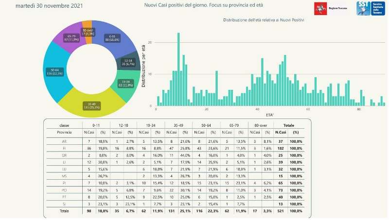 L'età media dei 521 nuovi positivi odierni è di 40 anni circa (26% ha meno di 20 anni, 18% tra 20 e 39 anni, 36% tra 40 e 59 anni, 17% tra 60 e 79 anni, 3% ha 80 anni o più).