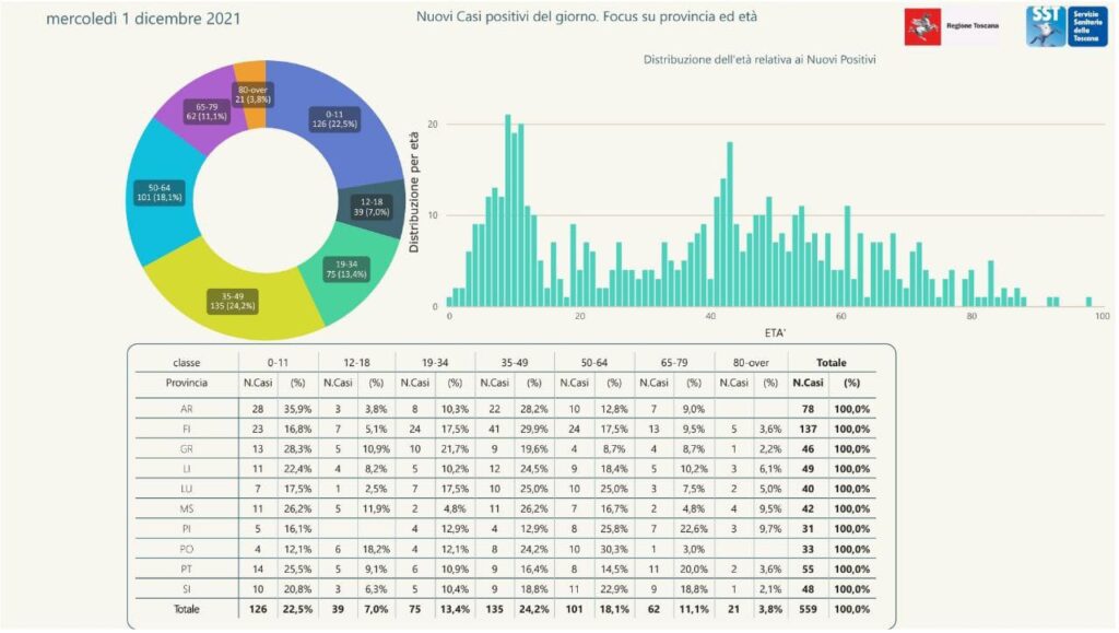 L'età media dei 559 nuovi positivi odierni è di 38 anni circa (31% ha meno di 20 anni, 18% tra 20 e 39 anni, 31% tra 40 e 59 anni, 16% tra 60 e 79 anni, 4% ha 80 anni o più).