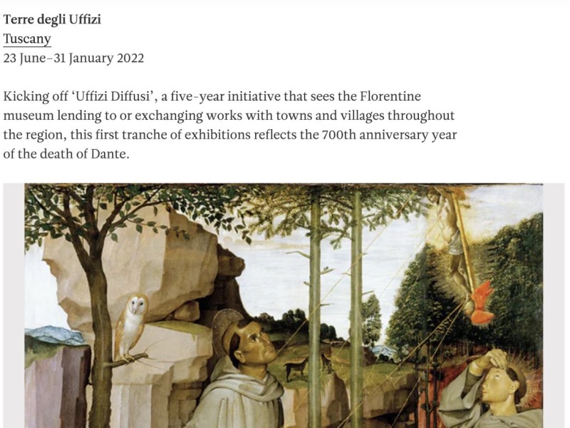 Nuovo riconoscimento per le Gallerie degli Uffizi. Dopo l'inclusione del progetto Uffizi diffusi tra 'I 100 luoghi da visitare nel 2021' selezionati annualmente dal Time e il primo posto nella classifica dei 'Best museums of the world' conferito dalla rivista angloamericana Timeout, arriva adesso l'inserimento di Terre degli Uffizi, programma di esposizioni sul territorio toscano curato dalle Gallerie insieme alla Fondazione CF Firenze nell'ambito dei rispettivi progetti Uffizi Diffusi e Piccoli Grandi Musei, nella top list delle 'Mostre dell'anno' curata da uno dei più prestigiosi magazine internazionali dedicati al mondo dell'arte, l'Apollo Magazine (qui). La selezione, al cui vertice, come esposizione dell'anno, c'è la mostra antologica sull’artista americana Alice Neel, 'People come first', organizzata dal Metropolitan Museum di New York, è pubblicata sul nuovo numero della rivista, in uscita a dicembre. Insieme a Terre degli Uffizi ("Un'iniziativa quinquennale che vede il museo fiorentino prestare o scambiare opere con città della regione: la prima tranche di mostre riflette il 700enario della morte di Dante", spiega Apollo nell'articolo), nella top list ci sono la rassegna sui dipinti di natura paesaggistica di Rubens della Wallace Collection di Londra, una retrospettiva sull'artista Paula Rego (Tate Britain, sempre Londra), L'oro della grande steppa (Fitzwilliam museum, Cambridge), esposizione archeologica incentrata su manufatti aurei ritrovati nell'ambito di recenti scavi nel Kazakhistan dell'est, la collettiva pittorica su schiavitù e colonialismo del Rijksmuseum, Amsterdam.