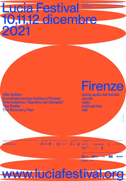 Un Festival internazionale che ospita narrazioni audio provenienti da tutto il mondo e che - grazie alla produzione curata di video di sottotitolazione -  propone contenuti accessibili a tutti, per la prima volta in lingua italiana. Oltre alle sessioni di ascolto, Lucia offre anche un calendario di performance live e incontri con autori e audio maker. Lucia Festival torna a Firenze dal 10 al 12 dicembre con una terza edizione diffusa. Quest'anno infatti saranno cinque le sedi ospiti – Villa Galileo, la Fototeca del Kunsthistorisches Institut in Florenz, l’Orto botanico, The Stellar e The Recovery Plan – per costruire, attorno agli ascolti, altre costellazioni di storie, conoscenze e relazioni (tutti gli eventi di Lucia Festival sono ad ingresso libero con prenotazione, fatta eccezione per le visite guidate che prevedono un contributo di 5 € – info, prenotazioni e liste d'attesa su www.luciafestival.org - l’accesso è consentito solo con il Green Pass). Lucia Festival è curato da Radio Papesse e promosso in collaborazione con Fondazione Diaristica Nazionale Pieve Santo Stefano, Kunsthistorisches Institut in Florenz - Max-Planck-Institut, Università degli Studi di Firenze e Sistema Museale di Ateneo, The Recovery Plan - SRISA, The Stellar, Villa Romana.  Con il contributo di: Regione Toscana, Fondazione CR Firenze, European Cultural Foundation, Kingdom of the Netherland, Città Metropolitana di Firenze. Con il patrocinio di: Comune di Firenze. Partner: Oorzaken Festival, RAI Radio 3, Radio Techetè, Radio Atlas, MLOL, SDIAF, Anjmot.Il programma, gli ospiti e le anteprimeIl programma di questa edizione può essere letto come un percorso di riscoperta del corpo – fisico, e sociale – e del legame materico, culturale e metamorfico tra l’individuo e il mondo, tra ogni vita e la molteplicità di altre forme.Il Festival si apre venerdì 10 dicembre alle 18:30 a Villa Galileo (Via Pian dei Giullari 42), con “Corpi celesti, corpi in relazione” una lecture del Professor Emanuele Pace, astrofisico del Dipartimento di Fisica e Astronomia dell'Università di Firenze, che ci aiuterà a riconnettere i puntini tra il nostro innato bisogno di raccontare storie e la ricerca dell'ignoto che da sempre ci contraddistingue.Nella stessa sede, l’ultima residenza di Galileo Galilei e luogo dove lo scienziato scrisse Discorsi e dimostrazioni matematiche intorno a due nuove scienze, sarà presentato Meteor Bodies di Kate Donovan, lavoro prodotto nell’ambito del programma di mentorship europea You Are So Sound!, un percorso di formazione e produzione ideato da Radio Papesse e Lucia Festival con il sostegno della European Cultural Foundation. Meteor Bodies parla di meteore, meteoriti, di corpi celesti e corpi in trasformazione (ore 19 e in replica alle 21:30). È un lavoro che parte dalla storia di Ann Elizabeth Hodges - colpita nel 1954 da un meteorite di circa 4 chili - per intrecciare riflessioni più ampie sulla cura, sul sentirsi protetti, sui sogni, mentre in filigrana ci si chiede: cosa c'è in comune tra noi e queste rocce spaziali che sfrecciano nell’universo?Chiude la serata (alle 19:30 e in replica alle 22) la performance live di Sparizioni, una produzione di Muta Imago per Radio India / Teatro India e opera finalista al Prix Europa 2021. In esclusiva per Lucia Festival, Riccardo Fazi presenterà per la prima volta dal vivo uno degli episodi del programma, il sesto, Fly Me to the Moon: un road-podcast live attraverso i crateri lunari che oscilla tra nostalgia del futuro, mancanza di senno e desiderio di tornare a casa.La mattina dell’11 dicembre, la fototeca del Kunsthistorisches Institut in Florenz (Via dei Servi 51) ospita due lavori “dal futuro”: Life Chronicles of Dorothea Ïesj S.P.U di Almare e Vagues de Chaleur di Charo Calvo. In programma alle 10:30 Vagues de Chaleur è un un'audio fiction che intreccia fantascienza ed ecofemminismo. Finalista nel 2021 a Phonurgia Nova, racconta la storia di Phalena, una creatura del futuro e membro di una civiltà sotterranea che scopre un documentario sonoro del 2020.La sorprende sentire delle donne che parlano di menopausa, gravidanza, amore, ecofemminismo e cambiamento climatico. Ispirata da loro, decide di registrare un messaggio per la superficie.Life Chronicles of Dorothea Ïesj S.P.U di Almare (ore 12:15, alla presenza degli autori) prende spunto dall’archeologia sonora e in particolare dalle teorie dell’archeo-acustica e descrive un futuro immaginario in cui il suono può essere estratto dagli oggetti e dalla materia. Life Chronicles è un audio romanzo che indaga il legame tra capitalismo dei dati, tecnologia e creazione di valore. Nel pomeriggio dell’11 dicembre, il festival prosegue all’Orto botanico - Sistema Museale d’Ateneo  (Via Pier Antonio Micheli 3) con una selezione di storie che – attraverso diversi linguaggi, dal documentario alla poesia sonora e al paesaggio sonoro – ci riportano alla natura. In programma Het bos heeft ons niet nodig - La foresta non ha bisogno di noi di Joyce De Badts e Tom Loois, il video The difference between a bird and a plane di Laura Malacart, A walk through my cūcū’s farm di Nyokabi Kariūki e Drip Drop di Simina Oprescu (dalle 13.30 alle 15.30).Ne La foresta non ha bisogno di noi (ore 14:15 e in replica alle ore 15) la documentarista Joyce de Badts e il designer Tom Loois invitano a riflettere sull’impatto che abbiamo sugli ecosistemi boschivi nel più ampio e complesso processo di cambiamento climatico. Le foreste assorbono il carbonio, aiutano a combattere il riscaldamento globale ma crescono lentamente mentre le nostre scelte e i nostri comportamenti hanno un impatto distruttivo, immediato, nell’oggi. Gli alberi vivono un altro tempo, forse – dicono - dovremmo semplicemente ripensare a come viviamo il nostro. Het bos heeft ons niet nodig - La foresta non ha bisogno di noi è un lavoro presentato in collaborazione con Oorzaken Festival, Amsterdam, grazi