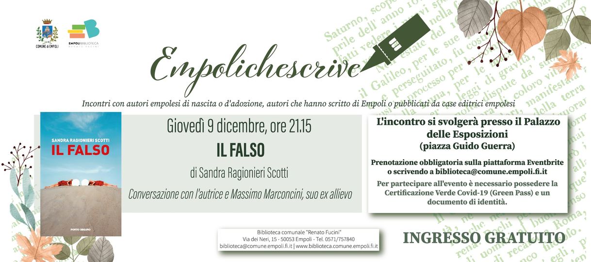 Sandra Ragionieri Scotti, professoressa amatissima ex insegnante di Discipline economico aziendali all'Istituto professionale "Leonardo da Vinci" di Empoli, presenta al Palazzo delle Esposizioni, in piazza guido Guerra, il suo romanzo giallo intitolato ‘Il falso’ (Porto Seguro editore). Appuntamento giovedì 9 dicembre 2021, alle 21.15. La ex docente sarà accompagnata in questo viaggio dall’assessore Massimo Marconcini, suo ex allievo.