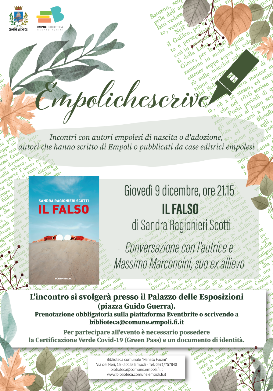 Sandra Ragionieri Scotti, professoressa amatissima ex insegnante di Discipline economico aziendali all'Istituto professionale "Leonardo da Vinci" di Empoli, presenta al Palazzo delle Esposizioni, in piazza guido Guerra, il suo romanzo giallo intitolato ‘Il falso’ (Porto Seguro editore). Appuntamento giovedì 9 dicembre 2021, alle 21.15. La ex docente sarà accompagnata in questo viaggio dall’assessore Massimo Marconcini, suo ex allievo.