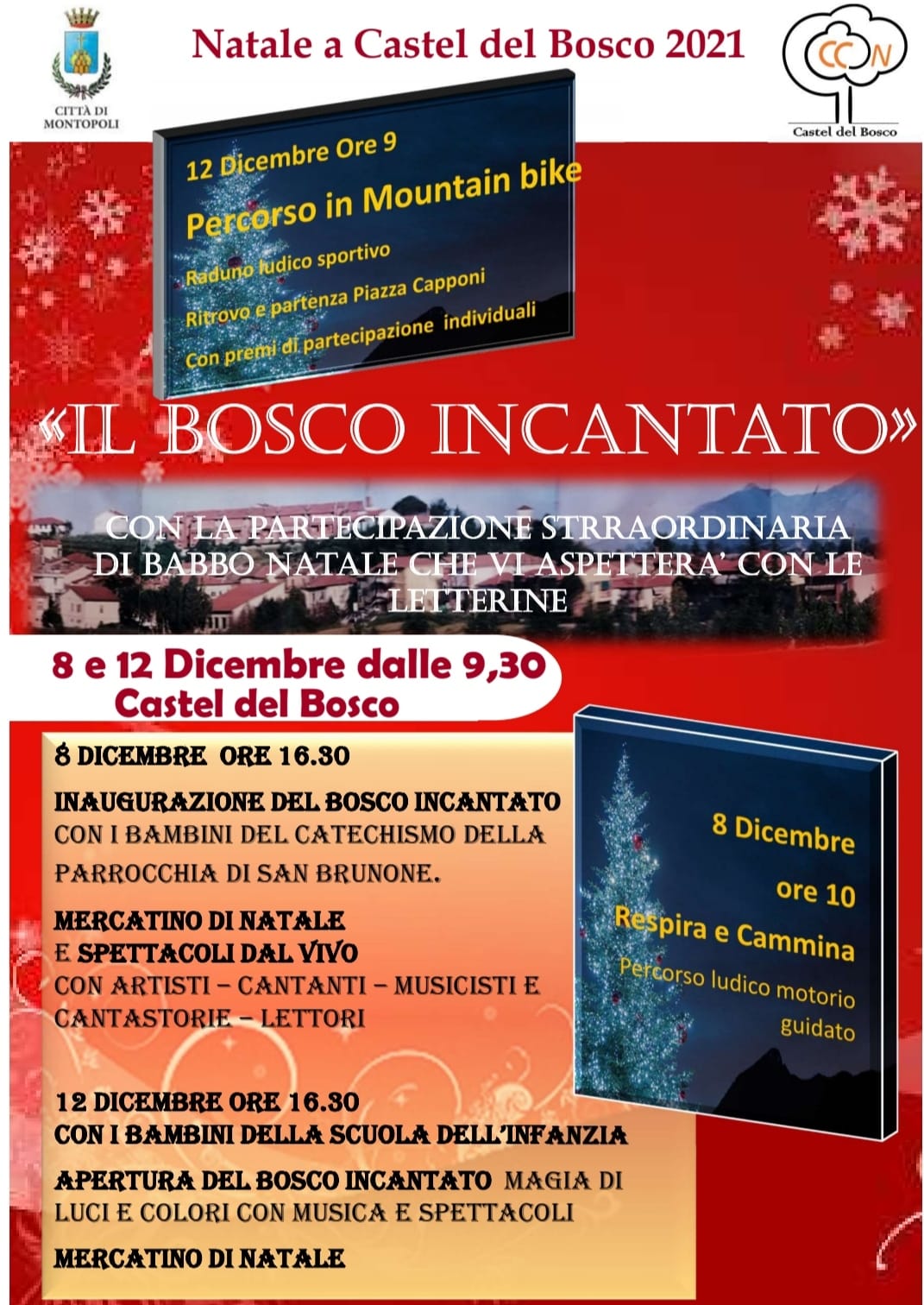 Si partirà dalla mattina, durante la quale si svolgeranno due eventi ludico sportivi; una passeggiata guidata da professionisti della Salute si svolgerà l’8 Dicembre e un raduno in mountain bike il 12. Poi nei pomeriggi il via al Bosco Incantato, un luogo sospeso tra favola e ambiente nostrano, all’interno del quale si potrà godere di musica, recitazione canto e letture, il tutto in una miscela live contornata da una atmosfera fiabesca. A completare l’armonia del Natale saranno i mercatini, che si svolgeranno per le due intere giornate.