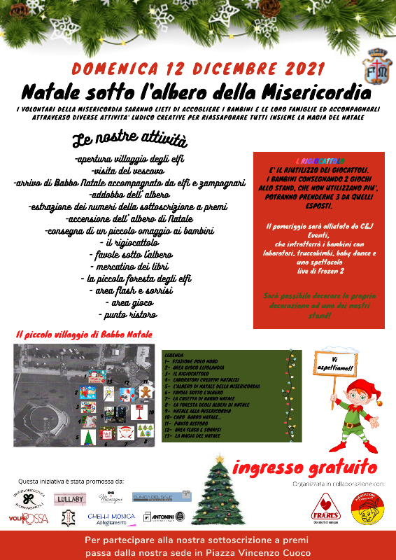Continua il progetto della Misericordia "Colora il tuo Natale", che da anni prevede la collaborazione delle scuole "Sacchetti" e "Buonarroti" coinvolgendo per la realizzazione degli addobbi la creatività dei piccoli studenti dell'infanzia e delle elementari. Saranno proprio le decorazioni dei bambini ad abbellire il grande albero di Natale della Misericordia che sarà allestito domenica 12 a partire dalle 14.30, con la collaborazione del distaccamento volontario dei Vigili del Fuoco di San Miniato. Anche nello stesso pomeriggio di domenica 12 bambine e bambini, anche non frequentanti le scuole sanminiatesi, potranno continuare a decorare gli addobbi. Inoltre la Misericordia di San Miniato Basso ha creato in piazza Cuoco un piccolo villaggio degli elfi, dove bimbi e famiglie avranno la possibilità di incontrare Babbo Natale e di partecipare a diverse attività ludiche e laboratori creativi.