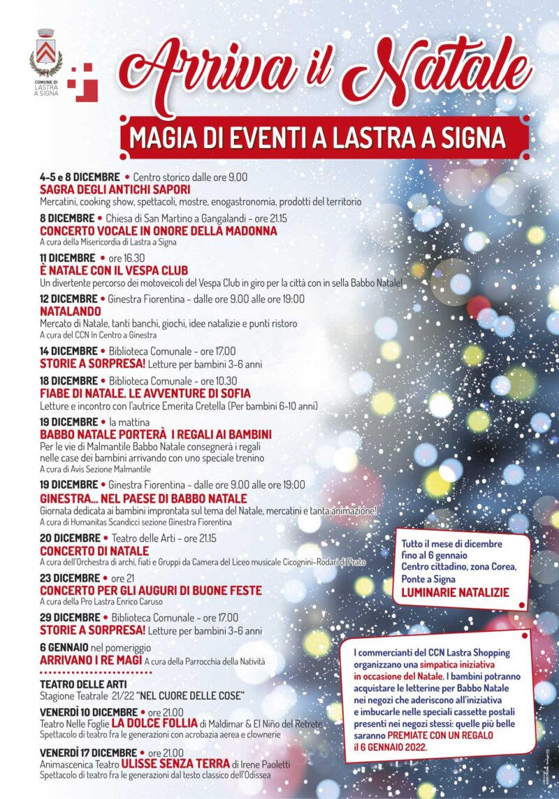 I commercianti del CCN Lastra Shopping organizzano un’iniziativa in occasione del Natale: i bambini potranno acquistare le letterine per Babbo Natale nei negozi che aderiscono all’iniziativa e imbucarle in speciali cassette postali presenti nei negozi stessi e quelle più belle saranno premiate con un regalo il 6 gennaio 2022. Infine nel pomeriggio del 6 gennaio iniziativa dedicata all’arrivo dei Re Magi a cura della Parrocchia della Natività.