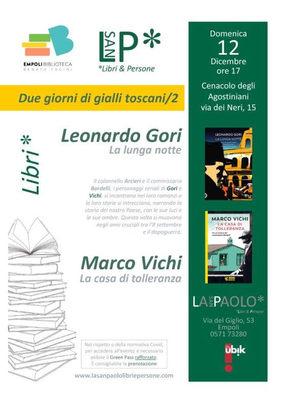 Domenica 12 dicembre 2021, alle 17, nel Cenacolo degli Agostiniani, in Via dei Neri, 15, il ciclo del giallo si chiuderà con i libri degli autori Marco Vichi, con il suo ‘La casa di tolleranza’, e Leonardo Gori e il suo ‘La lunga notte’.