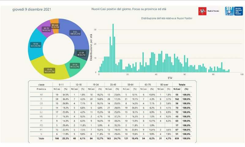 L'età media dei 659 nuovi positivi odierni è di 37 anni circa (31% ha meno di 20 anni, 21% tra 20 e 39 anni, 29% tra 40 e 59 anni, 14% tra 60 e 79 anni, 5% ha 80 anni o più).