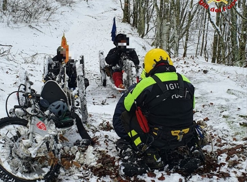 Tre persone sono rimaste bloccate in zona impervia con delle handbike elettriche e sono state raggiunte dall'elisoccorritore dei pompieri per poi essere recuperate.