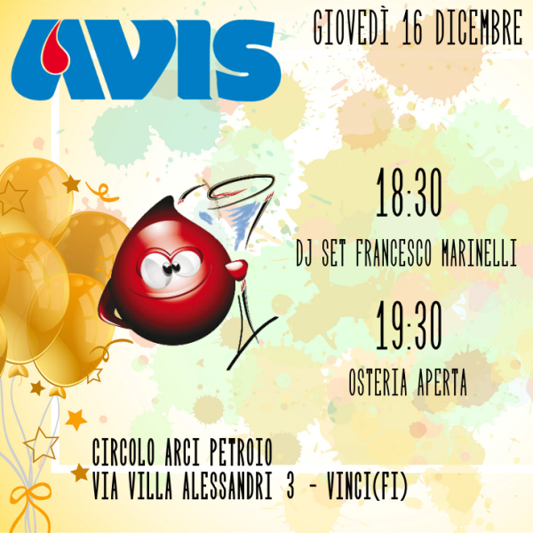 Questa settimana, due eventi all'insegna della solidarietà a Vinci targati Avis. I donatori di sangue organizzano per giovedì 16 dicembre un aperitivo, più cena, al Circolo Arci di Petroio in via Villa Alessandri 3 a Vinci. Si inizia alle 18.30 con il dj set di Francesco Marinelli per poi continuare alle 19.30 con la cena.