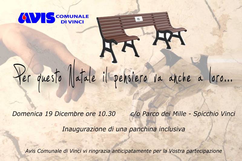 Il secondo appuntamento con l'Avis comunale di Vinci è per domenica 19 dicembre con l'inaugurazione di una panchina inclusiva al Parco dei Mille, nella frazione di Spicchio. L'evento, a ridosso delle festività natalizie, sarà alle 10.30.
