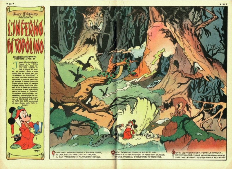 “Che si trovi a sostituire Lucifero in chiave di tormentatore - commenta Leonardo Canova - come accade nel celebre Inferno di Topolino firmato da Guido Martina, o ad interpretare una versione ipermoderna di se stesso, come nella straordinaria opera di Marcello Toninelli o ancora che sia ridotto ad un vecchietto scappato dall’ospizio, come in Cattivik, o ad un cantautorucolo squattrinato, come in Geppo, Dante è sempre Dante”.