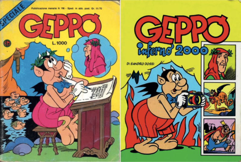 “Che si trovi a sostituire Lucifero in chiave di tormentatore - commenta Leonardo Canova - come accade nel celebre Inferno di Topolino firmato da Guido Martina, o ad interpretare una versione ipermoderna di se stesso, come nella straordinaria opera di Marcello Toninelli o ancora che sia ridotto ad un vecchietto scappato dall’ospizio, come in Cattivik, o ad un cantautorucolo squattrinato, come in Geppo, Dante è sempre Dante”.