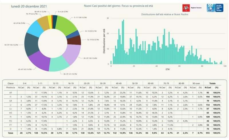 L'età media dei 955 nuovi positivi odierni è di 38 anni circa (26% ha meno di 20 anni, 26% tra 20 e 39 anni, 29% tra 40 e 59 anni, 16% tra 60 e 79 anni, 3% ha 80 anni o più).