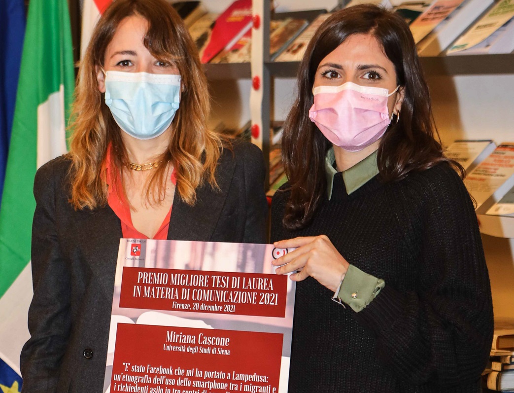Il premio del Comitato Regionale per le Comunicazioni della Toscana (Corecom) per la migliore tesi di laurea magistrale in comunicazione, giunto alla quinta edizione, è stato assegnato ad un laureata dell’Università di Siena, Miriana Cascone, per la tesi dal titolo “È stato Facebook che mi ha portato a Lampedusa. Un’etnografia dell’uso dello smartphone tra i migranti e i richiedenti asilo in tre centri di accoglienza italiani”.