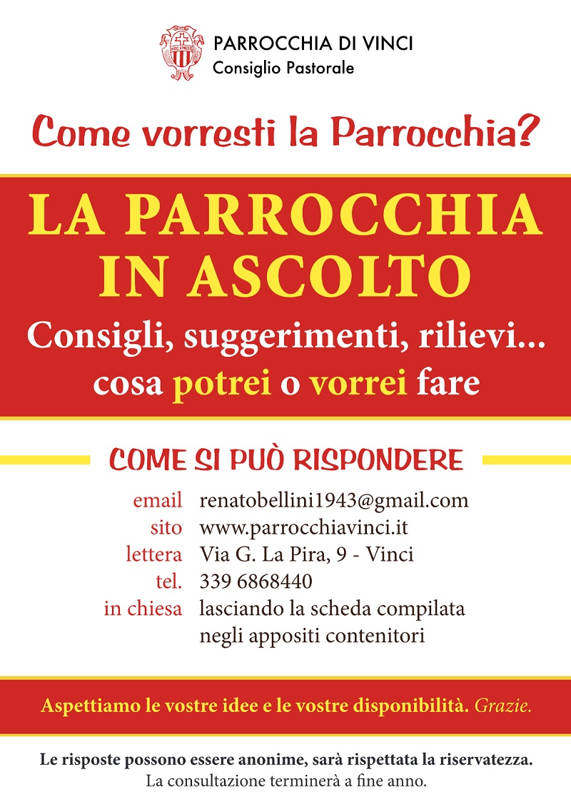 Dal 1 novembre al 31 dicembre: due mesi che la Parrocchia di Vinci sta dedicando per ripensare oggi la Parrocchia, la sua struttura interna, il suo approccio verso la gente!