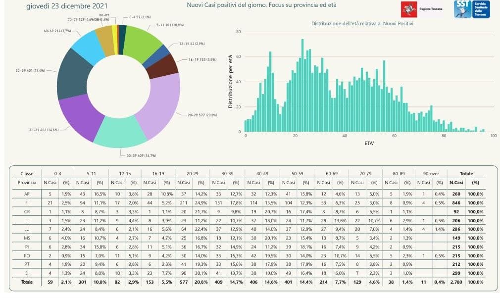 L'età media dei 2.780 nuovi positivi odierni è di 37 anni circa (21% ha meno di 20 anni, 36% tra 20 e 39 anni, 29% tra 40 e 59 anni, 12% tra 60 e 79 anni, 2% ha 80 anni o più).