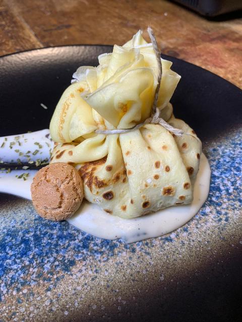Fagottino Crispy su fonduta di Gorgonzola e amaretti