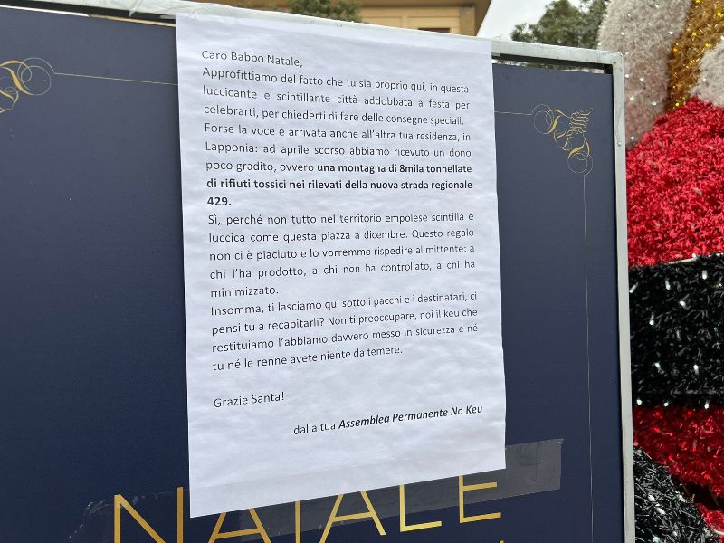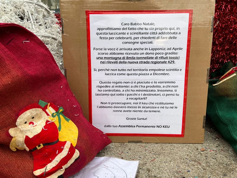 Approfittiamo del fatto che tu sia proprio qui, in questa luccicante e scintillante città addobbata a festa per celebrarti, per chiederti di fare delle consegne speciali. Forse la voce è arrivata anche all’altra tua residenza, in Lapponia: ad aprile scorso abbiamo ricevuto un dono poco gradito, ovvero una montagna di 8mila tonnellate di rifiuti tossici nei rilevati della nuova strada regionale 429. Sì, perché non tutto nel territorio empolese scintilla e luccica come questa piazza a dicembre. Questo regalo non ci è piaciuto e lo vorremmo rispedire al mittente: a chi l’ha prodotto, a chi non ha controllato, a chi ha minimizzato.