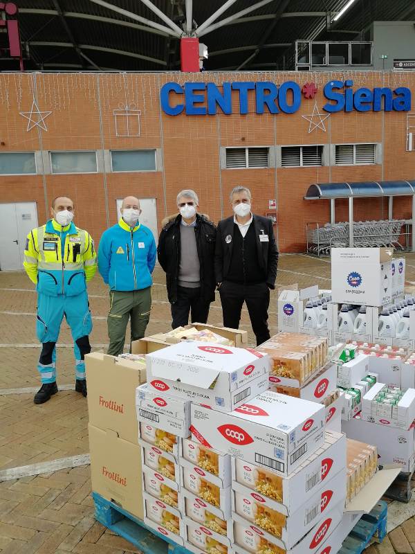 Non si ferma neanche a Natale la solidarietà della sezione soci Coop di Siena, che in questi giorni festivi ha fatto una donazione di generi alimentari di base e prodotti per l'igiene a Arciconfraternita Misericordia di Siena e Caritas di Siena.