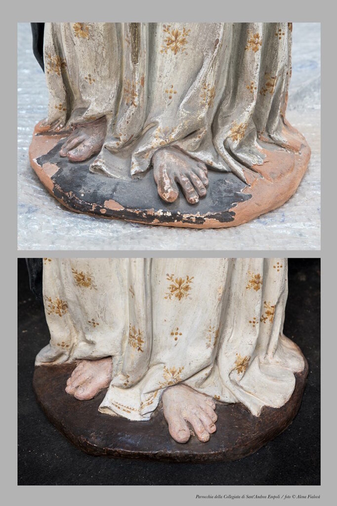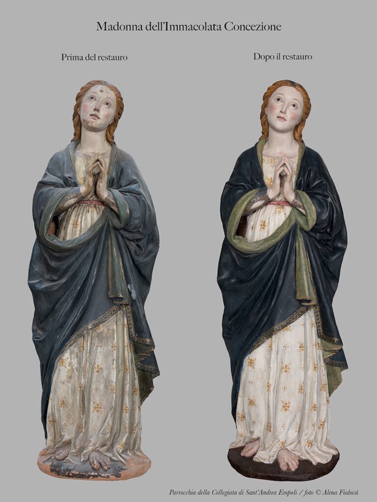 Dopo aver terminato il restauro della Pietà “Bandini” di Michelangelo, al Museo dell’Opera di Firenze, Paola Rosa ed Emanuela Peiretti si sono prese cura della piccola terracotta policroma e della sua base. Il restauro, iniziato a Ottobre, è terminato a Dicembre del 2021, ed è stato effettuato sotto l’alta sorveglianza della dott.ssa Anna Floridia, della Soprintendenza Archeologia Belle Arti e Paesaggio per la città metropolitana di Firenze e le province di Pistoia e Prato. E’ stata effettuata un’accurata pulitura delle superfici, recuperando in particolare la cromia dei raffinati “incarnati” del volto, delle mani e della veste bianca, consolidando localmente la terracotta e integrando le parti perdute sulle quali è stato eseguito un minuzioso ritocco pittorico. Il manto della Madonna non è stato riportato alla sua cromia originaria perché molto lacunosa. D’altronde, considerando il discreto stato di conservazione delle ridipinture effettuate nel corso degli anni, è stato deciso di mantenerle conservando l’aspetto ormai acquisito dalla Madonnina nell’immaginario collettivo. Una cura particolare ha richiesto il basamento in terracotta dorata, che rappresenta l’incontro dei genitori di Maria, Gioacchino ed Anna, alle Porta Aurea di Gerusalemme. Interessante è stato scoprire (indagando la datazione con la termoluminescenza) che in realtà si tratta di una formella in terracotta realizzata probabilmente nel 1700, quando la Madonnina è stata collocata nell’attuale cappella e quindi non è coeva alla statua. Si è fermato il degrado in parte dovuto all’umidità e si è recuperato, per quanto possibile, il modellato dei personaggi rappresentati, grazie anche a una foto degli anni ’70 che ha fatto da riferimento certo per le restauratrici. Le analisi diagnostiche sono state effettuate dalla ditta ADARTE di Firenze, i ponteggi dalla ditta Saccenti di Prato e le fotografie da Alena Fialová. Tecnico progettista e direttore dei lavori: ing. Emilio Cioni e arch. Silvano Salvadori.