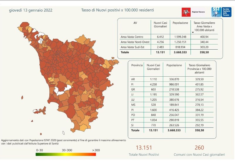 La Toscana si trova al 9° posto in Italia come numerosità di casi (comprensivi di residenti e non residenti), con circa 14.826 casi per 100.000 abitanti (media italiana circa 13.456 x100.000, dato di ieri). Le province di notifica con il tasso più alto sono Prato con 16.779 casi x100.000 abitanti, Firenze con 16.412, Pistoia con 16.368, la più bassa Grosseto con 10.232.