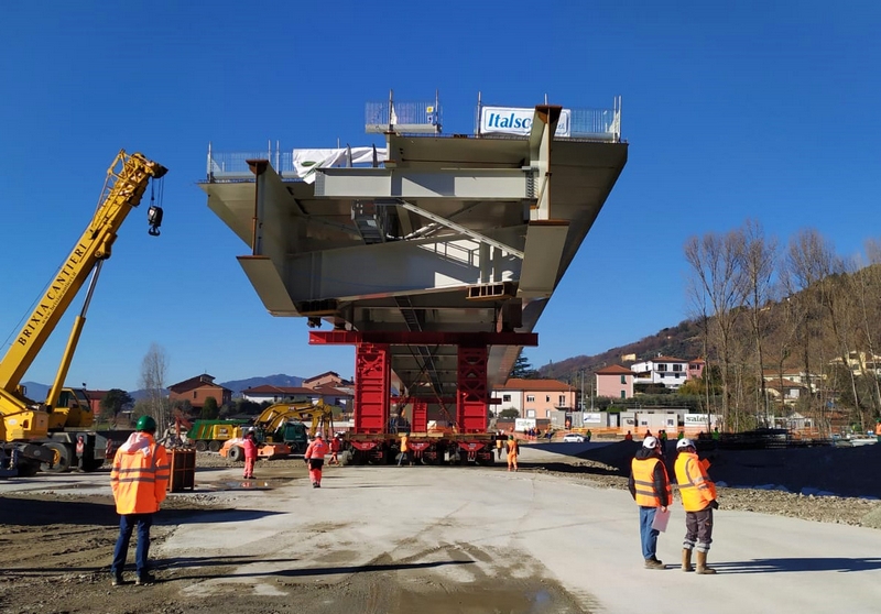 Nel cantiere per la costruzione del nuovo ponte di Albiano Magra si sono concluse le operazioni di varo della campata centrale, costituita da una struttura metallica (concio) lunga 102 metri per circa 530 tonnellate di peso. La struttura, assemblata in cantiere, è stata sollevata con speciali macchinari e posizionata tra la seconda e la terza pila. Al contempo proseguono secondo il cronoprogramma le operazioni per l’assemblaggio e il varo delle altre tre campate per completare l’intero impalcato sul quale sarà poi realizzata la sovrastruttura stradale e la pavimentazione. Al fine di garantire la continuità di dialogo con il territorio interessato dal piano di interventi per la ricostruzione del nuovo ponte, il Commissario Straordinario Fulvio Maria Soccodato per l’occasione ha tenuto un sopralluogo in cantiere al quale sono intervenuti, tra gli altri, il viceministro delle Infrastrutture e Mobilità Sostenibili Alessandro Morelli, il Presidente della Regione Toscana Eugenio Giani, il presidente della Regione Liguria Giovanni Toti , Stefano Liani, Responsabile Toscana Anas e il sindaco di Aulla Roberto Valettini.