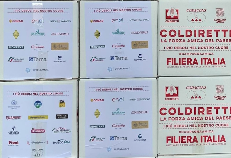 Ogni famiglia è destinataria di un pacco alimentare con prodotti 100% Made in Italy: dalla pasta ai legumi, dalla passata di pomodoro al cotechino, dal prosciutto crudo alla farina, dal Grana Padano al Parmigiano Reggiano, dal Provolone al latte UHT, dall’olio extra vergine di oliva alla mortadella, dalla carne in scatola ai biscotti per bambini agli omogeneizzati.