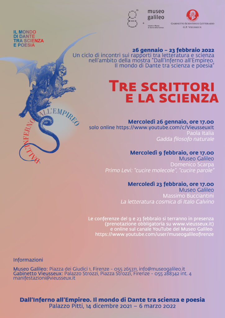 Le tre conferenze saranno introdotte da Filippo Camerota, Direttore scientifico del Museo Galileo e curatore della mostra “Dall’Inferno all’Empireo”, e da Gloria Manghetti, Direttrice del Gabinetto Vieusseux.