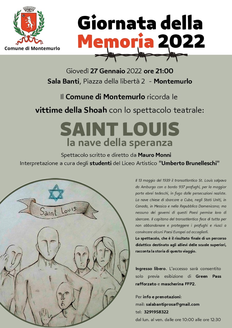 Il Comune di Montemurlo, nonostante l'emergenza sanitaria in corso, non rinuncia a celebrare la Giornata della Memoria e lo fa con uno spettacolo teatrale alla Sala Banti ( piazza della Libertà) aperto alla cittadinanza. Giovedì 27 gennaio ore 21 il regista e attore Mauro Monni e con gli studenti del Liceo Brunelleschi porta in scena “Saint Louis, la nave della speranza”.Il 13 maggio del 1939 il transatlantico Saint Louis salpava da Amburgo con a bordo 937 profughi, per la maggior parte ebrei tedeschi, in fuga dalle persecuzioni naziste. La nave chiese di sbarcare a Cuba, negli Stati Uniti, in Canada, in Messico e nella Repubblica Domenicana; ma nessuno dei governi di questi Paesi permise loro di sbarcare. Il capitano del transatlantico fece di tutto per non abbandonare e proteggere i profughi e riuscì a convincere alcuni Paesi Europei ad accoglierli. Lo spettacolo, che è il risultato finale di un percorso didattico destinato agli allievi delle scuole superiori, racconta la storia di questo viaggio.