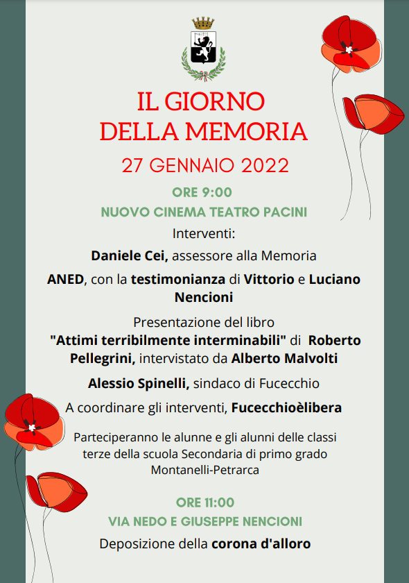 Giovedì 27 gennaio 2022 al Nuovo Teatro Pacini di Fucecchio, nell'ambito della "Giornata della Memoria" presentazione del libro di Roberto Pellegrini sulla prigionia di suo padre Gino nei campi di concentramento tedeschi ("Attimi terribilmente interminabili" Edizioni dell'Erba)