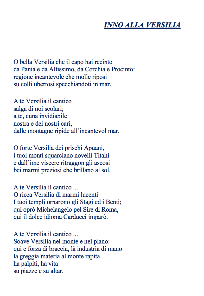 Dall'analisi della prof.ssa Silvia Bennati, dottoressa in Lettere e in Arti letterarie e musicali dal medioevo all'età contemporanea, emerge come l'inno sia un testo poetico e maestoso, che si configura come un omaggio della collettività alle bellezze della propria terra. Fatta di “montagne ripide” e “incantevol mar”, ricca di “marmi lucenti”, esaltandone le risorse, la laboriosità e la spiccata creatività di chi è nato o ha lavorato in Versilia. Fra i grandi, si chiamano in causa Carducci, Michelangelo, gli Stagi e i Benti, a completamento di questa lirica solenne che aveva, originariamente, come destinatarie per l'esecuzione le scolaresche, spesso in occasione di cerimonie ed eventi.