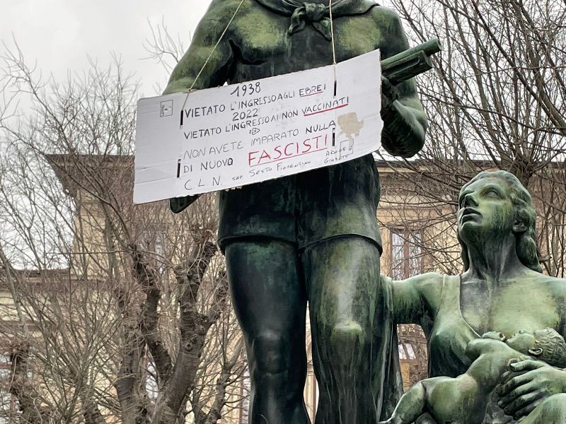 Ennesima protesta inqualificabile da parte dei no vax, in occasione del Giorno della Memoria a Sesto Fiorentino. Un cartello che paragona assurdamente le leggi razziali e le limitazioni per gli ebrei con le disposizioni in vigore per chi non è vaccinato contro il Covid-19 è apparso sul Monumento al Partigiano ed è stato rimosso dagli agenti del commissariato di polizia.