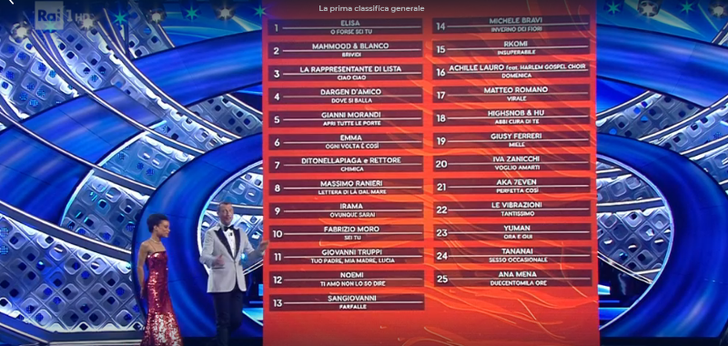 La prima classifica generale Sanremo 2022 (mercoledì 2 febbraio)