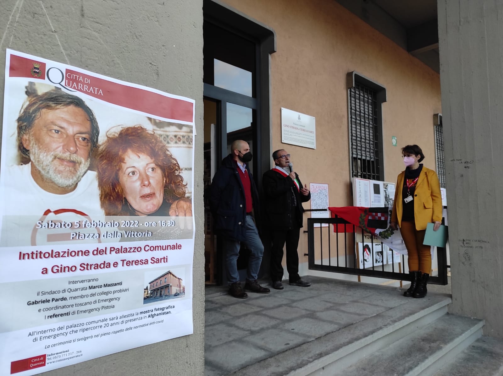 “Come ho avuto modo di affermare in altre occasioni – ha spiegato il Sindaco di Quarrata Marco Mazzanti - Teresa Sarti e Gino Strada hanno speso la loro vita a favore dell’altro ed in particolare del più debole, a prescindere dalla sua appartenenza, cultura, idee, religione, etnia. Con questa intitolazione facciamo nostro il loro messaggio, a favore della pace, contro la guerra e per il diritto alle cure mediche per tutti: un messaggio, che credo debba essere da chiunque condiviso. La loro è stata una missione laica, che ha unito l’azione concreta per un’assistenza sanitaria gratuita e di qualità nei più tragici teatri di conflitto e di povertà del mondo, ad una costante e schietta denuncia degli orrori della guerra e un’azione di sensibilizzazione dei governi e dell’opinione pubblica sulle tragiche conseguenze dei conflitti, al fine di promuovere una diffusa cultura della Pace. Ricordo ancora l’intervento di Gino Strada in occasione della Marcia della Giustizia del 2002 a Quarrata, quando tuonò contro le guerre in medio oriente, a partire proprio dall’Afghanistan: proprio per mostrare i molti anni di presenza di Emergency in Afghanistan ospitiamo da oggi, per un mese, nel nostro palazzo comunale, una mostra sul tema".