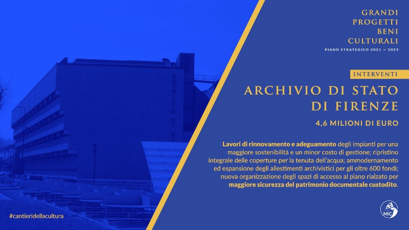 A Firenze invece arrivano 4,6 milioni di euro per l'Archivio di Stato: anche in questo caso serviranno nuovi impianti per maggiore sostenibilità e un abbattimento dei costi di gestione. Verrà rifatto il tetto per la tenuta dell'acqua. L'archivio verrà ammodernato e ampliato per gli oltre 600 fondi presenti. Le documentazioni saranno custodite e salvaguardate con una nuova organizzazione degli spazi di accesso al piano rialzato.