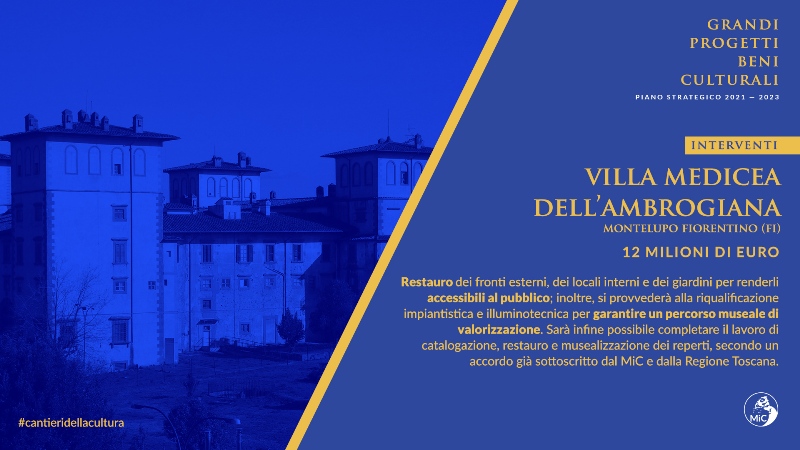 Il ministro Dario Franceschini per la Toscana ha pensato a tre investimenti di portata eccezionale: il primo riguarda il recupero della Villa Medicea dell'Ambrogiana di Montelupo Fiorentino per 12 milioni di euro. Il progetto prevede il restauro dei fronti esterni, dei locali interni e dei giardini per l'accessibilità al pubblico. Servirà anche un nuovo impianto elettrico e di illuminazione per un percorso museale da valorizzare. Il Ministero completerà la catalogazione, il restauro e la musealizzazione dei reperti dopo l'accordo sottoscritto con la Regione Toscana.