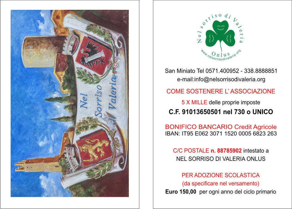 Nel nuovo anno siamo tornati alle attività sociali con l' incontro presso l'Istituto Cattaneo di San Miniato in occasione della conferenza stampa per la distribuzione solidale dei fondi raccolti con l'offerta del libro ricordo di Gianluca Bertini, di cui l'Associazione è stata destinataria in parte. Onorati per la scelta e grati verso i promotori dell'iniziativa e verso i familiari di Gianluca, abbiamo assicurato l'utilizzo dei fondi per le nostre iniziative nel campo dell'istruzione, salvo individuare in seguito l'impiego specifico. Sul sito il servizio fotografico di Federica Antonelli. Intanto invito tutti i soci a rinnovare la tessera sociale del 2022 ricordando l'importo delle quote, che è di euro 100 per i soci fondatori ed di euro 20 per i soci ordinari. Si può fare il versamento, anche cumulativo indicando i nominativi, con bonifico bancario o c.c. postale, i cui estremi sono indicati nel biglietto da visita allegato o nel sito www.nelsorrisodivaleria.org.