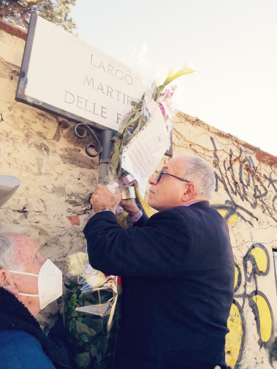 Nella prima foto, il Fondatore del Comitato Marco Cordone mette un mazzo di fiori alla targa toponomastica Largo Martiri delle Foibe;nella seconda, sempre Marco Cordone, insieme agli esuli Severino Bergamo e Miriam Andreatini (storica delegata degli esuli Giuliano - Dalmati a Firenze e provincia), espongono la bandiera istriana.