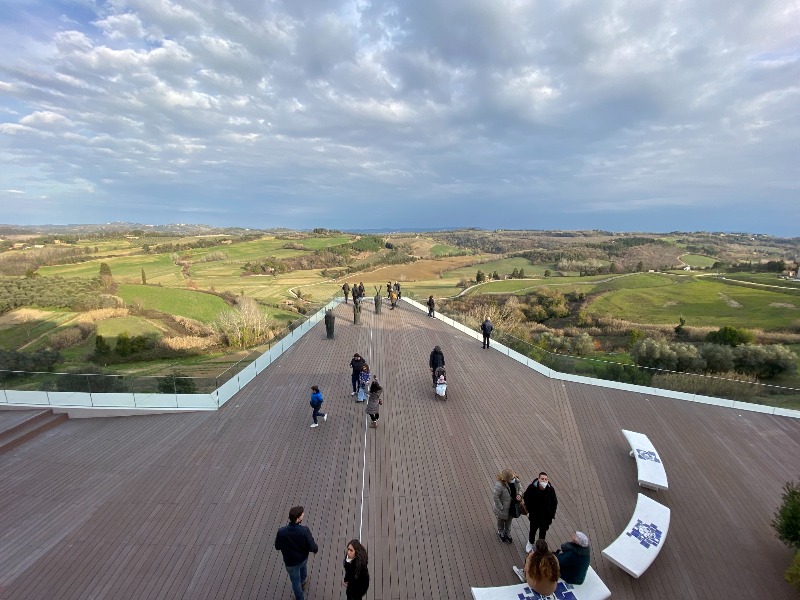 Tappa a seguire sul colle vicino, al limite sud del comune di Terricciola con arrivo a Pieve de' Pitti dove, oltre all’illustrazione del territorio e delle caratteristiche principali delle denominazioni e dei vitigni, il gruppo ha pranzato con i sapori locali, Pecorino delle Balze Volterrane DOP, il tartufo, la pasta, il tutto accompagnato dai Vini della Doc Terre di Pisa e nella bellissima dimora storica dell’azienda. Pomeriggio dedicato al dirimpettaio colle per la visita guidata al borgo di Peccioli, con le sue diffuse installazioni di arte contemporanea, la visita del “Palazzo senza Tempo” e delle altre bellezze del luogo. Immancabile, infine, la visita di Pisa con sosta guidata in Piazza dei Miracoli e giro nel centro città.