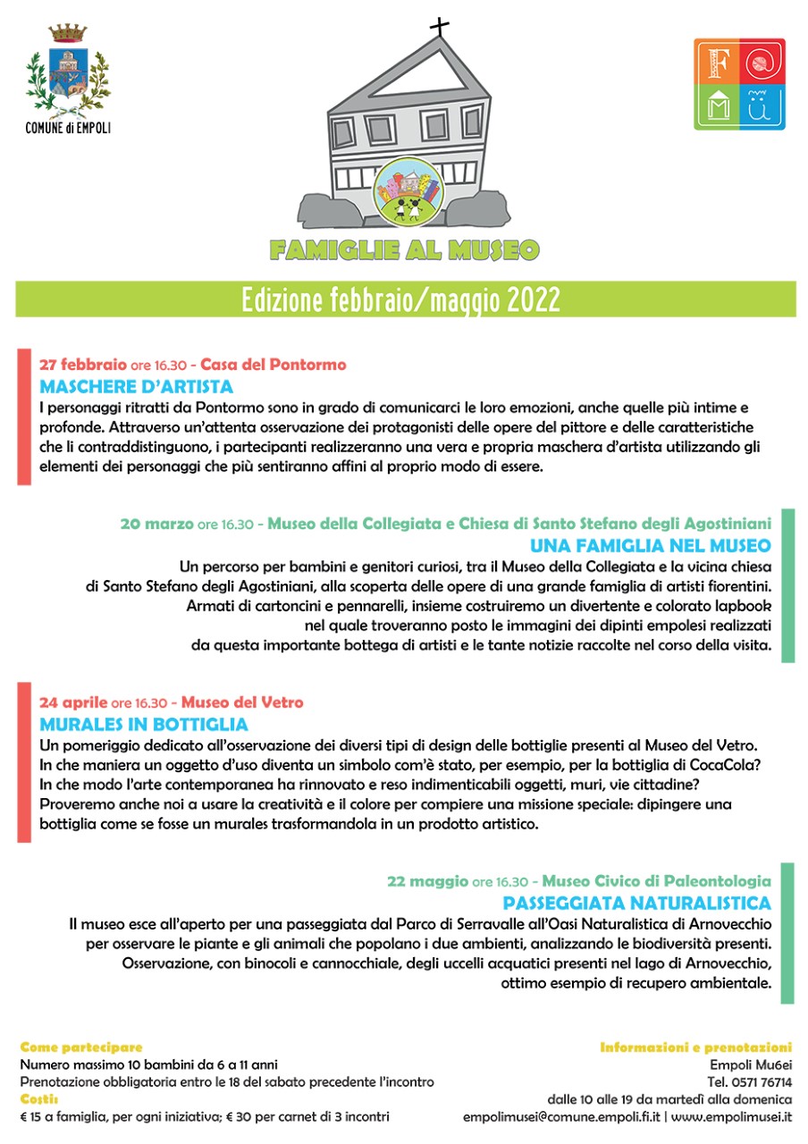 27 febbraio, ore 16.30 – Casa del PontormoMaschere d’artistaI personaggi ritratti da Pontormo sono in grado di comunicarci le loro emozioni, anche quelle più intime e profonde. Attraverso un’attenta osservazione dei protagonisti delle opere del pittore e delle caratteristiche che li contraddistinguono, i partecipanti realizzeranno una vera e propria maschera d’artista utilizzando gli elementi dei personaggi che più sentiranno affini al proprio modo di essere.Target: bambini da 6 a 11 anni20 marzo, ore 16.30 – Museo della Collegiata e Chiesa di santo Stefano degli AgostinianiUna famiglia nel museoUn percorso per bambini e genitori curiosi, tra il Museo della Collegiata e la vicina chiesa di S. Stefano degli Agostiniani, alla scoperta delle opere di una grande famiglia di artisti fiorentini. Armati di cartoncini e pennarelli, Insieme costruiremo un divertente e colorato lapbook nel quale troveranno posto le immagini dei dipinti empolesi realizzati da questa importante bottega di artisti e tante notizie raccolte nel corso della visita.Target: bambini da 6 a 11 anni24 aprile, ore 16.30 – Museo del VetroMurales in bottigliaUn pomeriggio dedicato all’osservazione dei diversi tipi di design delle bottiglie presenti al MuVe.In che maniera un oggetto di uso diventa un simbolo come è stato per esempio per la bottiglia di CocaCola? In che modo l’arte contemporanea ha rinnovato e reso indimenticabili oggetti, muri, vie cittadine?Proveremo anche noi a usare la creatività e il colore per compiere una missione speciale: dipingere una bottiglia come se fosse un murales trasformandola in un prodotto artisticoTarget: bambini da 6 a 11 anni22 maggio, ore 16.30 – Museo Civico di PaleontologiaPasseggiata naturalisticaIl museo esce all’aperto per una passeggiata dal Parco di Serravalle all’Oasi Naturalistica di Arnovecchio per osservare le piante e gli animali che popolano i due ambienti analizzandone le biodiversità presenti. Osservazione, con binocoli e cannocchiale, degli uccelli acquatici presenti nel lago di Arnovecchio, ottimo esempio di recupero ambientale.Target: bambini da 6 a 11 anniPrenotazioniMassimo 10 bambini per ogni attività.La prenotazione è obbligatoria entro le 18 del sabato antecedente l’iniziativa scrivendo a: empolimusei@comune.empoli.fi.it o telefonando al numero 0571 76714.Costo delle attività1 solo appuntamento: 15.00 euro a famigliaCarnet di 3 appuntamenti: 30.00 euro a famigliaMisure anti-CovidViste le disposizioni per contrastare la diffusione del Covid-19, tutte le attività si svolgeranno nel rispetto della distanza di sicurezza e di tutte le misure igieniche necessarie.Per gli adulti accompagnatori è necessario il possesso del Green Pass come da normativa nazionale.ContattiEmpoli MuseiTel 0571 76714empolimusei@comune.empoli.fi.itwww.empolimusei.it