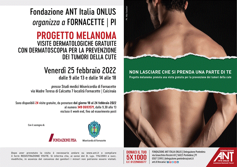 Fondazione ANT riprende il programma di prevenzione oncologica gratuita anche per i cittadini e le cittadine della Valdera. Venerdì 25 febbraio si terrà una giornata di Progetto melanoma, con visite specializzate con l’ausilio della dermatoscopia per il controllo dei nei e la diagnosi tempestiva di lesioni sospette e/o neoplastiche.