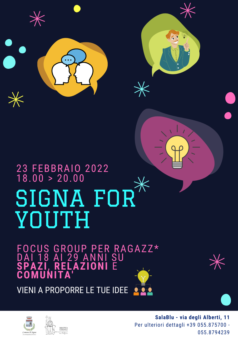 In programma per mercoledì 23 febbraio in SalaBlu a partire dalle 18.00 l’iniziativa SIGNA FOR YOUTH alla presenza del sindaco Giampiero Fossi e dell’assessore Gabriele Scalini. Una serata dedicata a ragazz* dai 18 ai 29 anni per raccogliere le loro idee e proposte sullo sviluppo del territorio. Un focus group su spazi, relazioni e comunità dal punto di vista dei più giovani, per indagare le loro esigenze e guardare al miglioramento dell’offerta comunale da un’altra prospettiva. L’iniziativa si svolgerà nel rispetto della normativa anticontagio: è fatto obbligo di indossare mascherine FFP2 e l’esibizione del super green pass per l’accesso.