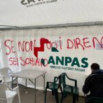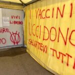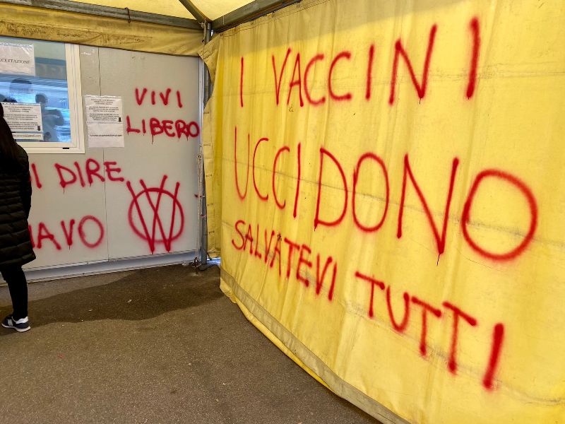 “Se non vuoi dire no sei schiavo” si legge nel gazebo di Anpas, proprio sopra a sedie e tavolini utilizzati nella fase dell’accettazione, prima del vaccino. O ancora “il governo mente”, fino alla frase sull’ingresso dell’Hub Asl Toscana Centro, “I vax uccidono” e altre ancora.