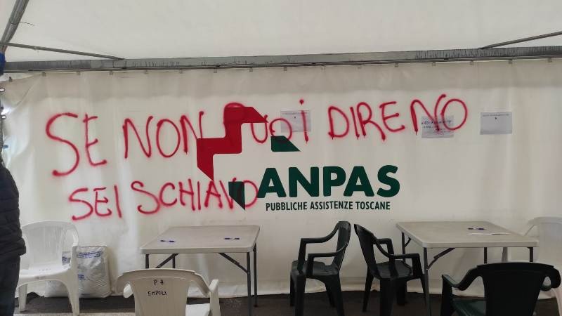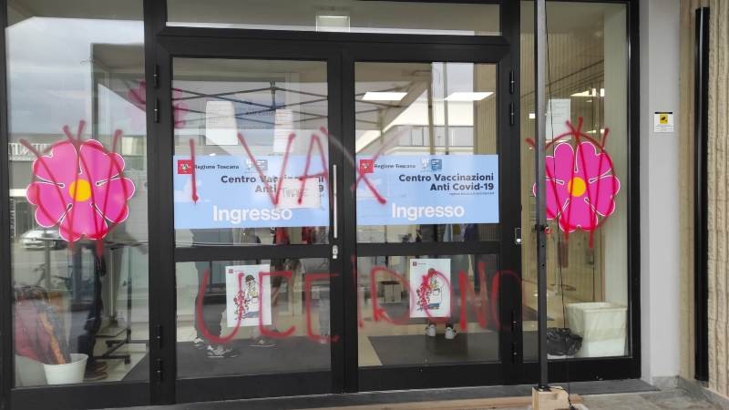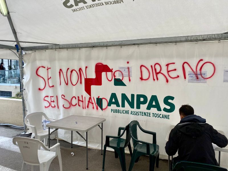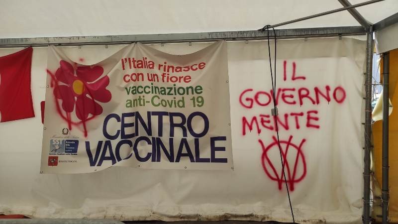 “Se non vuoi dire no sei schiavo” si legge nel gazebo di Anpas, proprio sopra a sedie e tavolini utilizzati nella fase dell’accettazione, prima del vaccino. O ancora “il governo mente”, fino alla frase sull’ingresso dell’Hub Asl Toscana Centro, “I vax uccidono” e altre ancora.