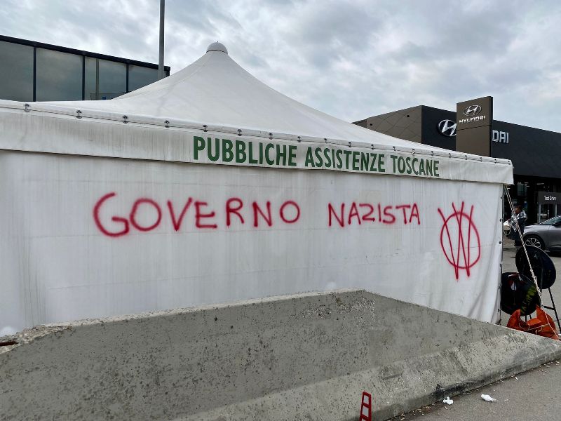 Continuano dunque nell’Empolese i danni alle strutture dedicate alla lotta al Covid-19. Neanche due mesi fa i teli del gazebo al punto tamponi gestito dalle Pubbliche Assistenze vicino al centro commerciale, furono ritrovati completamente tagliati. Era il 7 gennaio mentre nell’agosto 2021, lo stesso drive through fu imbrattato da scritte simili a quelle che oggi hanno danneggiato l’Hub.