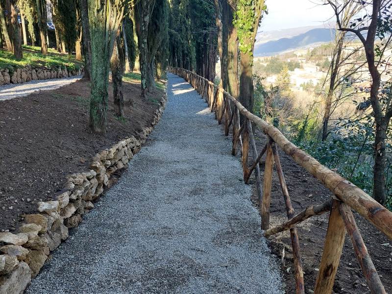 Il parco della Rimembranza finalmente viene restituito a ben più degna fruizione e in assoluta maggiore sicurezza da parte dei cittadini. I vialetti e le rampe cordonate di collegamento, previa una accurata ripulitura, sono stati riportati al rispettivo livello originario e successivamente rivestiti con pietrisco opportunamente rullato. I cordoli in pietra, in buona parte restaurati, sono così tornati alla luce nella loro autentica funzione di contenimento delle aiole intermedie, adeguatamente riqualificate. Il muro che delimita a monte il parco è stato messo in sicurezza rispetto alla fruizione del parcheggio sovrastante.