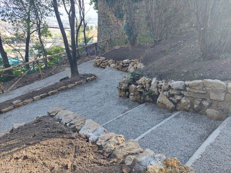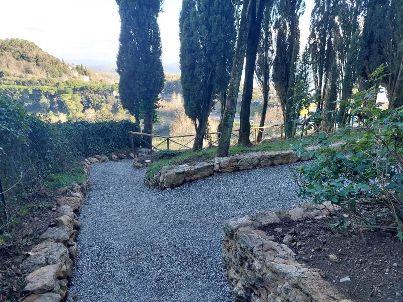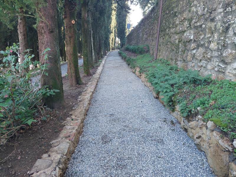Il parco della Rimembranza finalmente viene restituito a ben più degna fruizione e in assoluta maggiore sicurezza da parte dei cittadini. I vialetti e le rampe cordonate di collegamento, previa una accurata ripulitura, sono stati riportati al rispettivo livello originario e successivamente rivestiti con pietrisco opportunamente rullato. I cordoli in pietra, in buona parte restaurati, sono così tornati alla luce nella loro autentica funzione di contenimento delle aiole intermedie, adeguatamente riqualificate. Il muro che delimita a monte il parco è stato messo in sicurezza rispetto alla fruizione del parcheggio sovrastante.