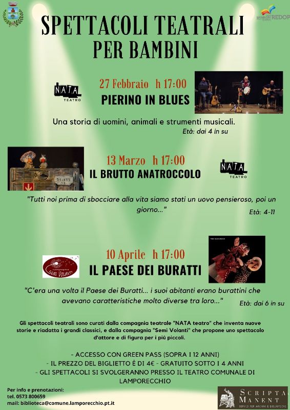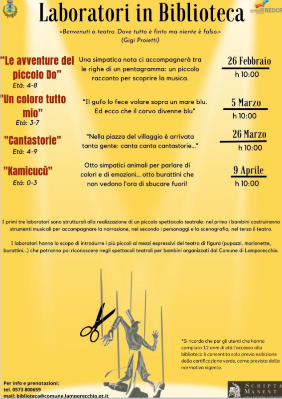 Il Comune di Lamporecchio e la Biblioteca Don Siro Butelli organizzano, a partire da sabato 26 febbraio, un programma di iniziative dedicate ai bambini che si alterneranno fra spettacoli a teatro, a cura delle compagnie “Nata teatro” e “Semi volanti”, letture e laboratori creativi in biblioteca, realizzati dalla cooperativa Scripta Manent.