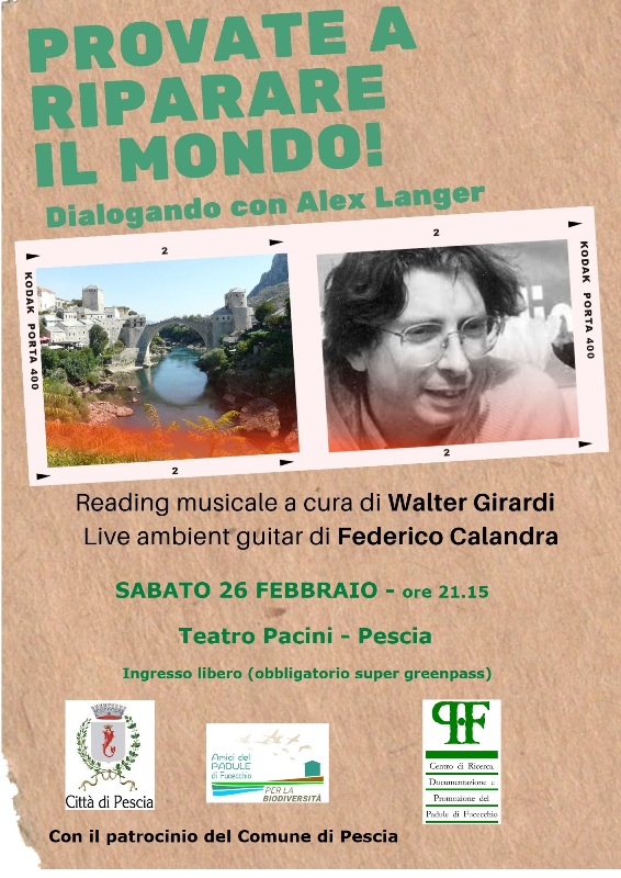 Il duo Walter Girardi e Federico Calandra presentano il reading musicale "Provate a riparare il mondo! Dialogando con Alex Langer" al Teatro Pacini di Pescia, sabato 26 febbraio, ore 21.15, con ingresso gratuito.